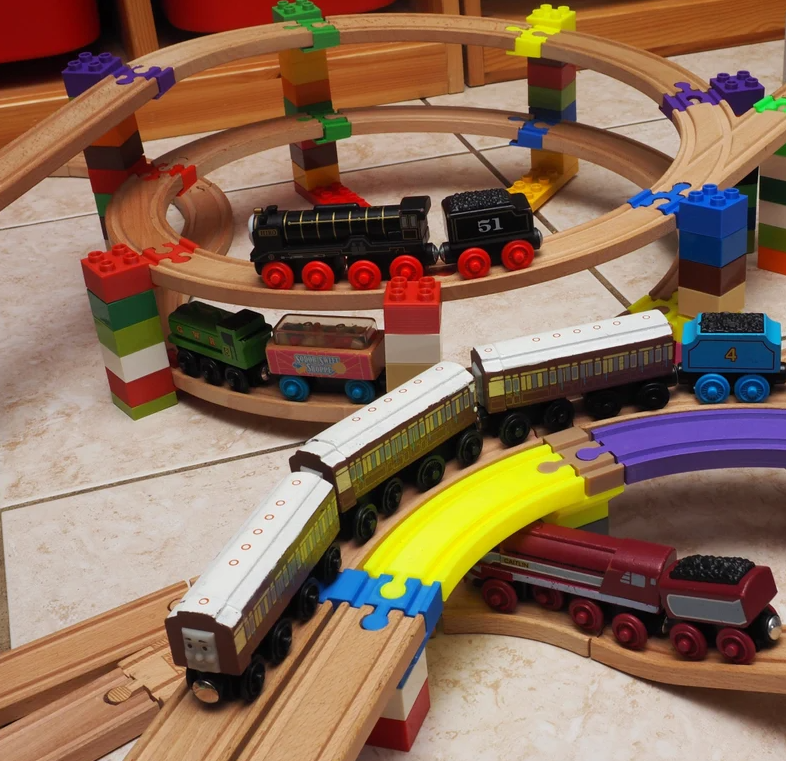 NOTE: Wooden train track pieces and Duplo block pieces are not included.